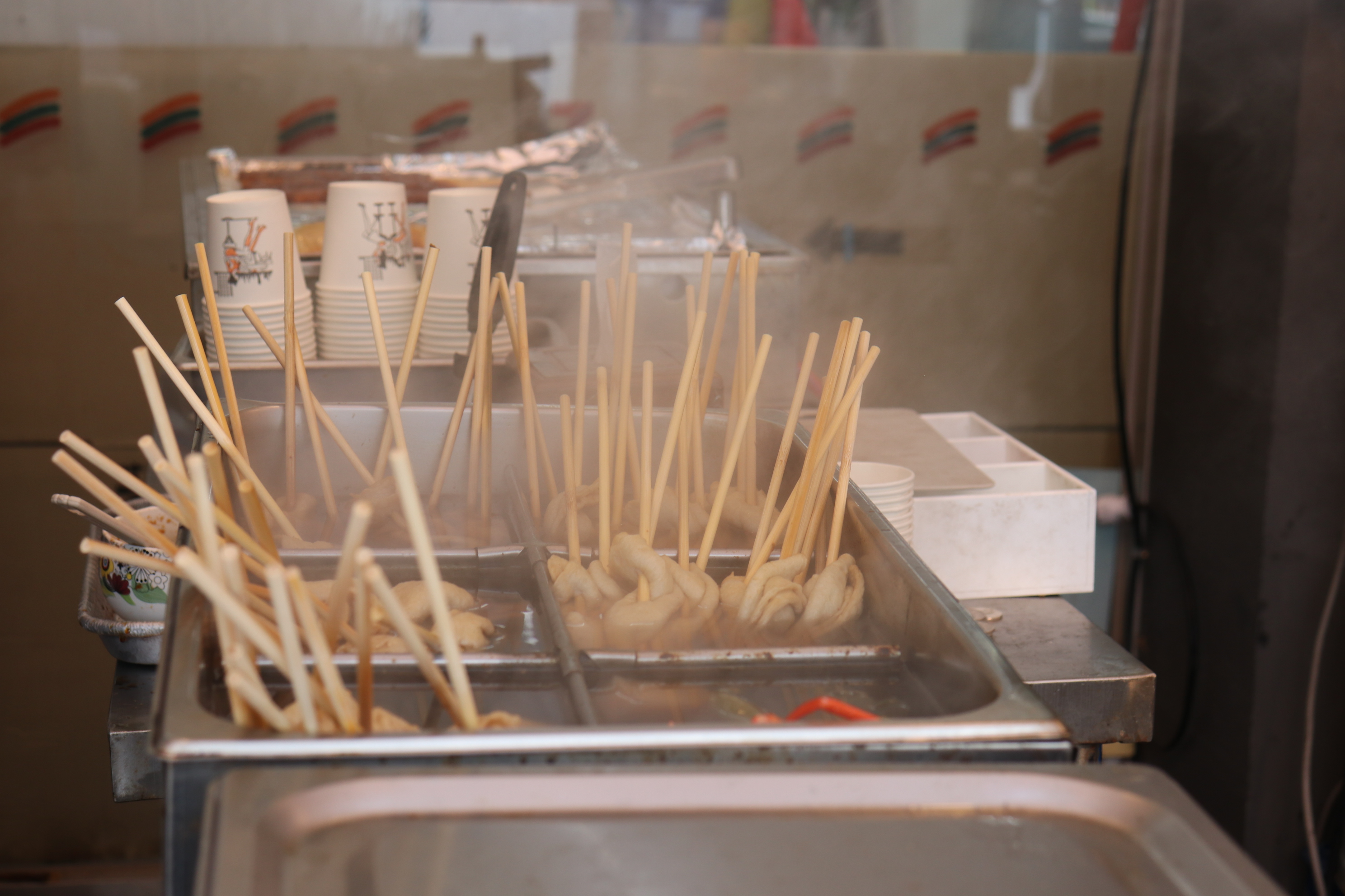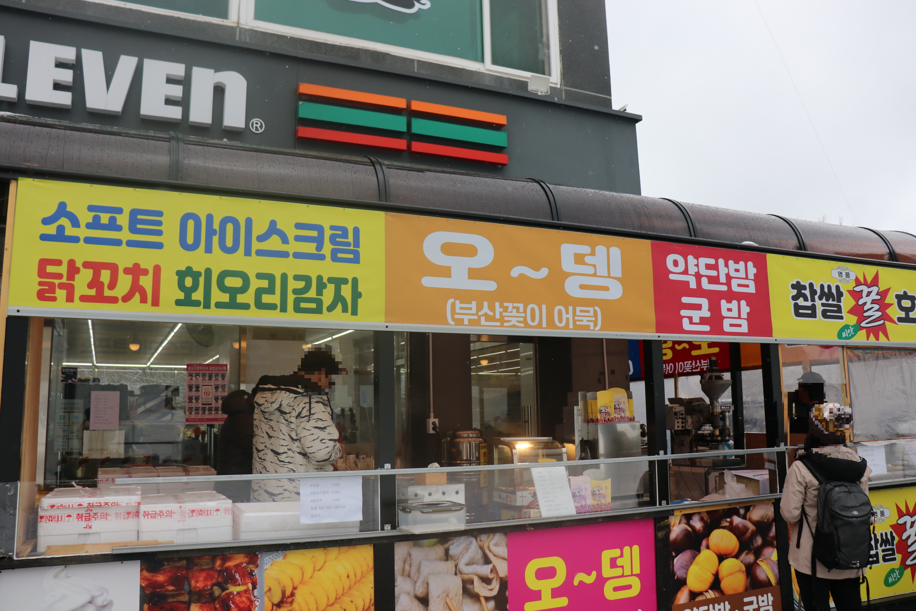 아이스크림, 닭꼬치, 회오리감자, 오~뎅, 약단밤 군밤, 찹쌀 꿀 호떡 을 파는 좌판과